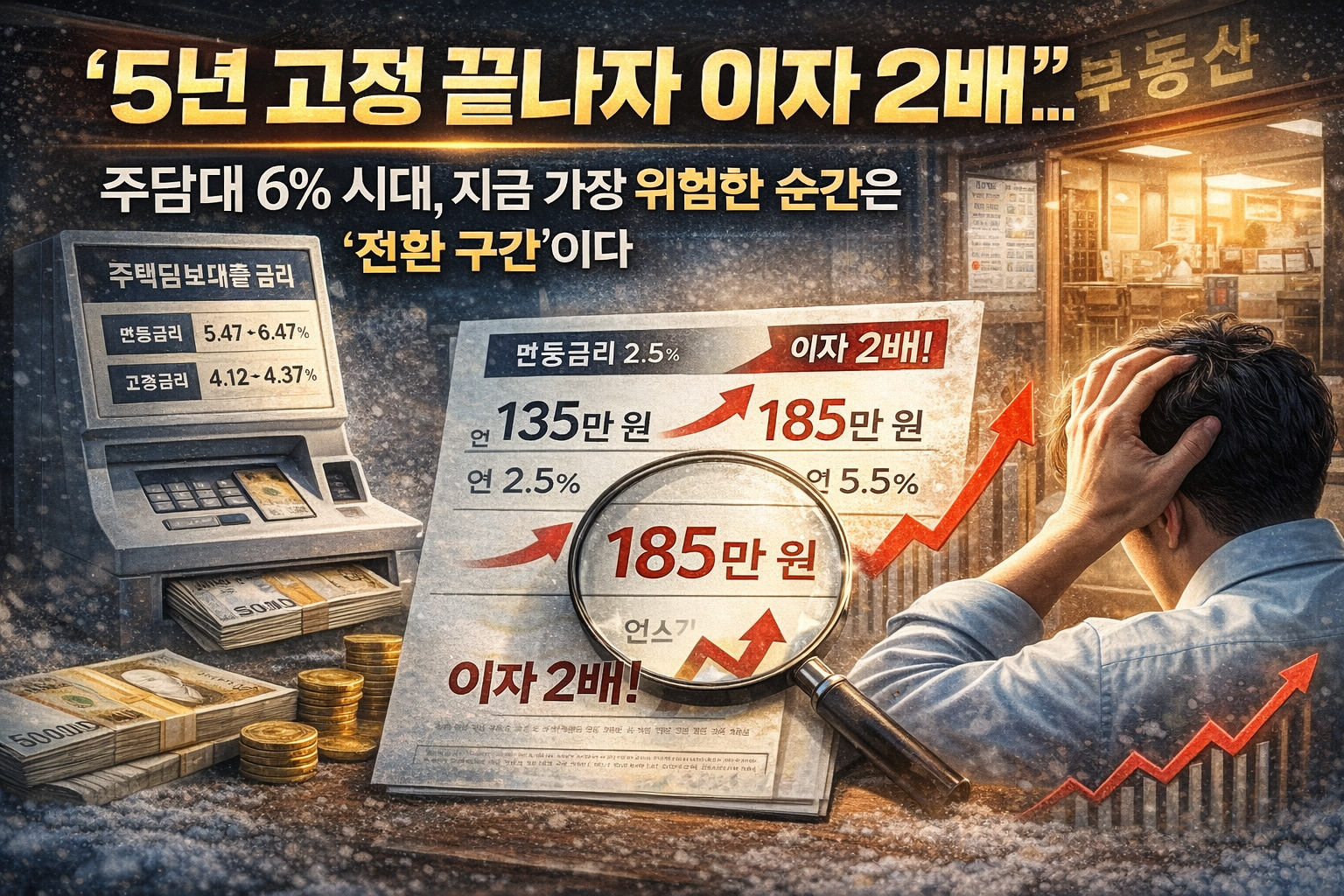 “5년 고정 끝나자 이자 2배”…주담대 6% 시대, 지금 가장 위험한 순간은 ‘전환 구간’이다 “금리는 내린다더니, 왜 내 대출이자는 더 오르지?”요즘 주택담보대출을 가진 사람들 사이에서 가장 많이 나오는 말이다.기준금리는 인하 기대가 돌았지만,현실의 주담대·전세대출 금리는 오히려 6% 중반까지 치솟고 있다. 이 현상은 단순한 금리 뉴스가 아니다. 지금 시장의 핵심 위험은 ‘고정금리에서 변동금리로 넘어가는 순간’,바로 전환 구간에 있다. 1️⃣ 지금 대출 시장에서 실제로 벌어지고 있는 일 최근 주요 시중은행의 주택담보대출 혼합형(5년 고정 후 변동) 금리는연 4% 초반부터 6% 중반까지 올라섰다. 금리 상단은 이미 6%대 중반을 넘기며 사실상 고금리 구간에 진입했다. 문제는 이 구조다. 2020..