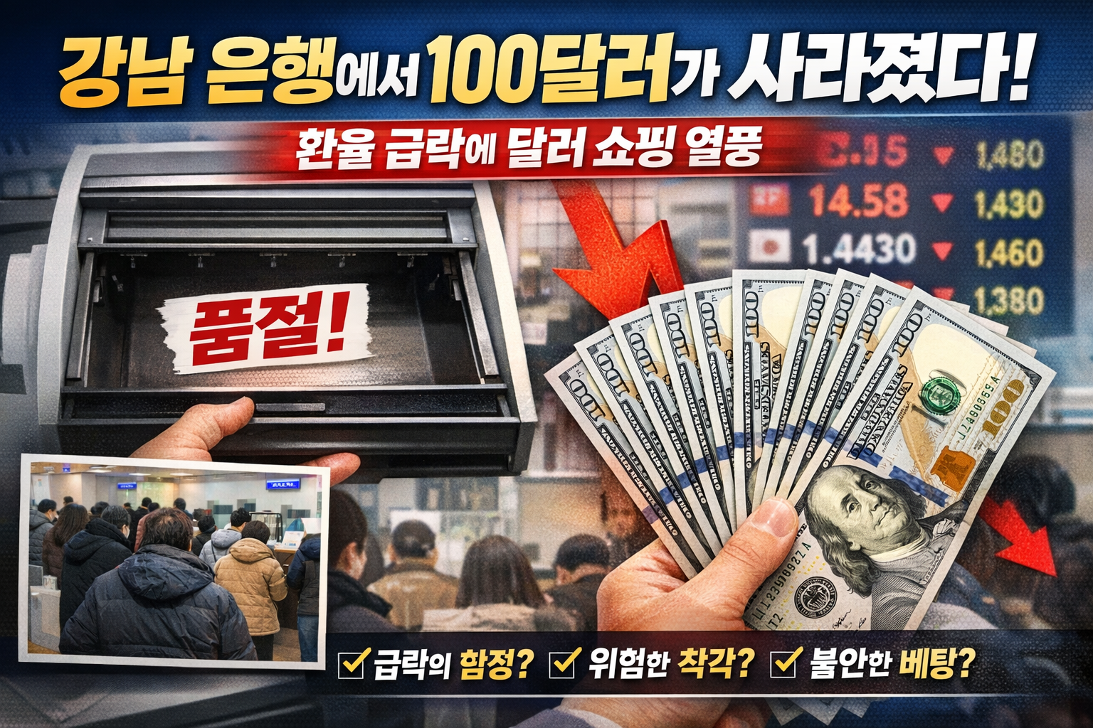 강남 은행에서 100달러가 사라졌다— 환율 급락이 만든 ‘달러 쇼핑’의 착시와 위험 신호 “강남 시중은행에서 100달러가 동났다.”하루 만에 원·달러 환율이 30원 넘게 급락하자, 은행 창구에 사람들이 몰렸다. 온라인 커뮤니티와 재테크 카페에서는“지금이 달러 저가 매수 기회”라는 말이 빠르게 퍼졌고,실제로 일부 은행 지점에서는 미화 100달러 지폐가 바닥났다. 이 장면은 단순한 해프닝이 아니다.환율이 움직일 때 개인들이 어떤 방식으로 반응하는지를그대로 보여주는 교과서 같은 사례다.그리고 동시에, 개인 투자자들이 가장 많이 착각하는 지점도 드러낸다. ✅ 하루 만에 -33.8원, 숫자가 만든 착시 이번 환율 급락은 분명 이례적이다. 원·달러 환율은 장중 1480원대까지 치솟았다가,외환당국의 강력한 구두..