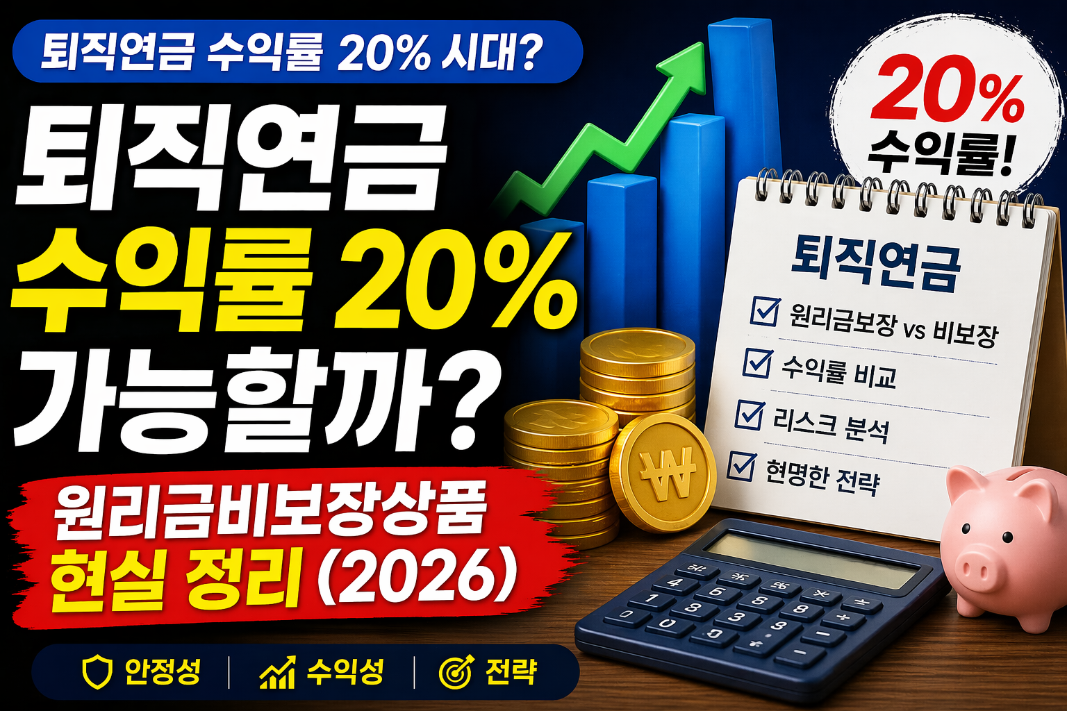 퇴직연금 수익률 20% 가능할까? 원리금비보장상품 현실 정리 (2026) 최근 금융권에서 눈에 띄는 소식이 하나 나왔다.👉 퇴직연금 수익률이 20%를 넘었다는 이야기 일부 은행 기준으로 원리금비보장상품의 수익률이DB형 16% 이상, DC형과 IRP는 20%를 넘는 수준까지 집계되면서많은 사람들이 이렇게 생각한다. 👉 “나도 저렇게 벌 수 있는 거 아닌가?”하지만 여기서 반드시 짚고 넘어가야 할 것이 있다. 👉 이 수익률은 “결과”이지 “보장”이 아니다 1️⃣ 퇴직연금 수익률이 높은 이유 최근 퇴직연금 수익률이 상승한 이유는 단순하다. 👉 시장 상승 영향주식시장 반등ETF 및 펀드 수익 증가금리 하락 기대 이 3가지가 동시에 작용하면서투자형 상품의 수익률이 크게 올라간 것이다 특히 원리..