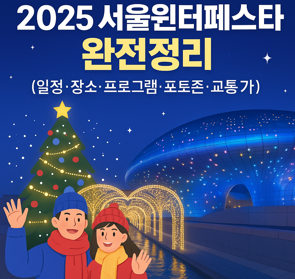 2025 서울윈터페스타 완전정리(일정·장소·프로그램·포토존·교통까지 한눈에 보는 가이드) 겨울이 깊어질수록 서울은 또 하나의 대표 축제를 맞이한다. 바로 도심 곳곳을 빛과 음악으로 물들이는 **‘서울윈터페스타(Seoul Winter Festa)’**다. 2025년 겨울 축제는 규모가 확대되고, 야간 콘텐츠가 크게 강화되며,시민 체감형 이벤트가 대폭 늘어날 예정이라 벌써부터 관심이 집중되고 있다.사진·데이트·가족 나들이까지 모두 충족하는 행사이기 때문에겨울 계획을 세우기 전에 확실하게 정리해두면 도움이 된다. 1️⃣ 2025 서울윈터페스타 개요기간: 2025년 12월 12일(금) ~ 2026년 1월 4일(일)장소: 서울광장, 청계천 일대, 동대문디자인플라자(DDP), 광화문광장 등입장료: 전 구간 ..