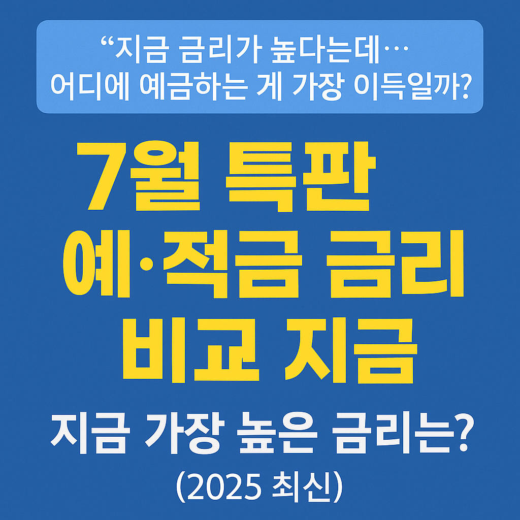 2025년 7월 특판 예·적금 금리 비교 – 지금 가장 높은 금리는? “지금 금리가 높다는데… 어디에 예금하는 게 가장 이득일까?” 2025년 7월 현재, 시중은행을 비롯해 인터넷은행, 저축은행, 지방은행에서단기 특판 예금과 고금리 적금 상품을 경쟁적으로 출시하고 있습니다. 특히 4%대 금리가 다시 등장하면서, "안전하면서 이자도 꽤 받는" 재테크 전략을 찾는 사람들이 늘고 있죠. 오늘은 2025년 7월 현재 가입 가능한 특판 예금·적금 상품을 한눈에 정리해드립니다. ✅ 예금 vs 적금, 뭐가 다를까?구분예금적금방식목돈을 한 번에 예치매달 일정 금액을 납입금리일반적으로 더 높음납입기간 따라 유동적대상여유자금 있는 사람목돈 만들고 싶은 사람유리한 시기금리 상승기금리 하락기 👉 2025년 7월 현재는..